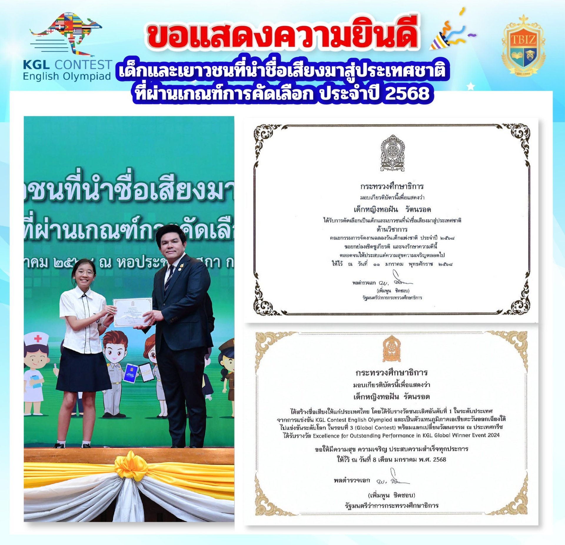 ขอแสดงความยินดีกับเด็ก ๆ ที่ได้รับรางวัลที่ 1-2-3 ในการแข่งขัน KGL Contest English Olympiad ปี 2024 ได้เข้ารับเกียรติบัตรรางวัลเด็กและเยาวชนที่นำชื่อเสียงมาสู่ประเทศชาติ ที่ผ่านเกณฑ์การคัดเลือก ประจำปี 2568 จากรัฐมนตรีช่วยว่าการกระทรวงศึกษาธิการ ท่านสุรศักดิ์ พันธ์เจริญวรกุล